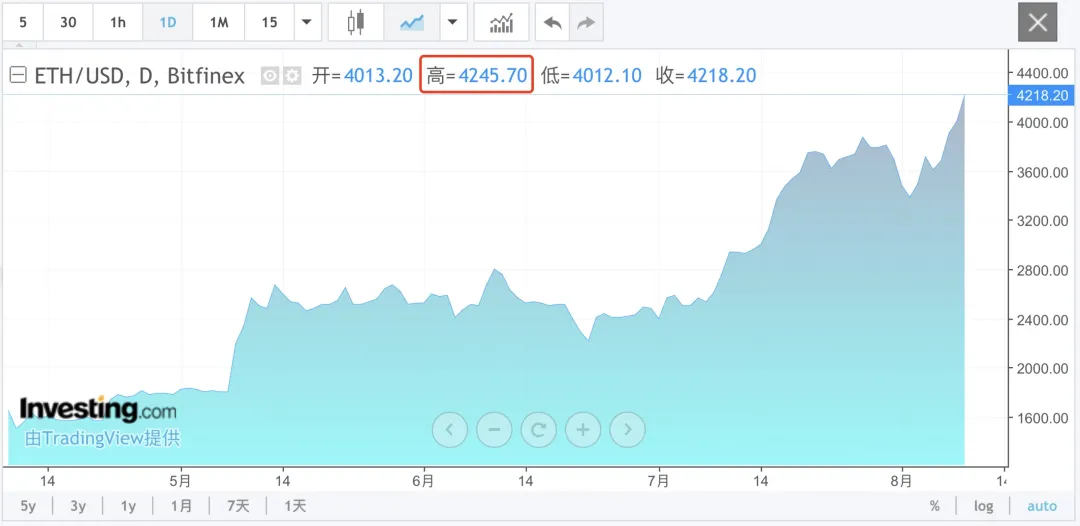 以太坊价格日内最高报4245.7美元,推动其市值重返5000亿美元上方,加密货币总市值一度突破4万亿美元。