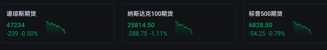 美股三大股指期货跌幅扩大,标普500指数期货跌0.8%,纳指100指数期货跌1.1%,道指期货跌0.5%。