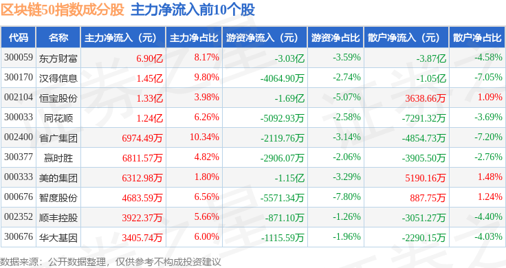 资金流向方面,区块链50(399286)指数成份股当日主力资金净流入合计8.21亿元,游资资金净流出合计10.57亿元,散户资金净流入合计2.36亿元。成份股资金流向详情见下表: