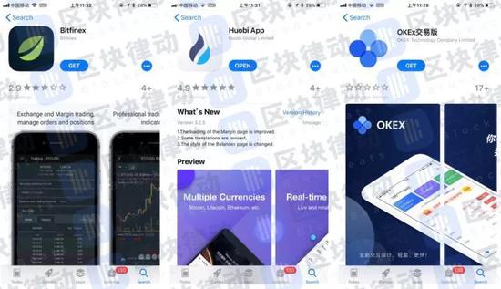 这种得不到结果的猜测,结合地区政策之后更是让人摸不着头脑。因为美国采取对虚拟货币的监管态度允许虚拟货币的交易,所以可以在美区的AppStore里下载到Bitfinex、BlockChainWallet、CoinBase、Huobi(火币)、OKEX等交易所的App。