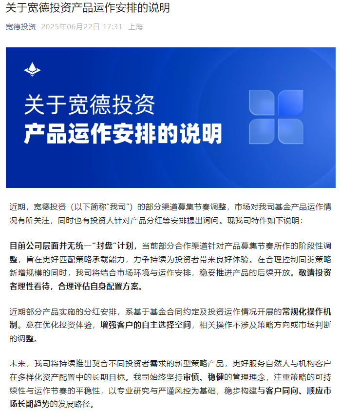 针对产品“封盘”的说法,宽德投资表示,目前公司层面并无统一“封盘”计划,当前部分合作渠道针对产品募集节奏所做的阶段性调整,旨在更好地匹配策略承载能力,力争持续为投资者带来良好体验。
