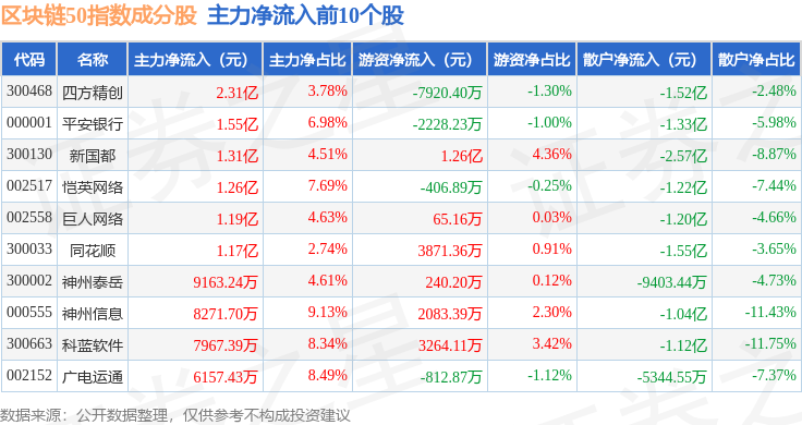 资金流向方面,区块链50(399286)指数成份股当日主力资金净流入合计3.92亿元,游资资金净流入合计5.08亿元,散户资金净流出合计9.01亿元。成份股资金流向详情见下表: