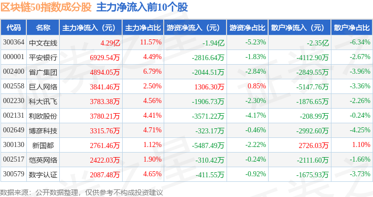 资金流向方面,区块链50(399286)指数成份股当日主力资金净流出合计16.18亿元,游资资金净流入合计2.22亿元,散户资金净流入合计13.97亿元。成份股资金流向详情见下表: