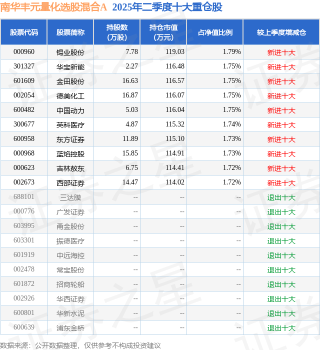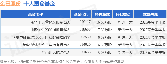 根据2025基金半年报公募基金重仓股数据,重仓该股的公募基金共5家,其中持有数量最多的公募基金为南华基金的南华丰元量化选股混合A。南华丰元量化选股混合A目前规模为0.26亿元,最新净值1.3822(8月13日),较上一交易日上涨0.82%,近一年上涨37.85%。该公募基金现任基金经理为黄志钢 康冬。黄志钢在任的基金产品包括:南华丰汇混合A,管理时间为2022年3月5日至今,期间收益率为74.19%;南华丰睿量化选股混合A,管理时间为2024年11月5日至今,期间收益率为15.06%;南华丰利量化选股混合A,管理时间为2025年3月7日至今,期间收益率为10.39%。康冬在任的基金产品包括:南华中证杭州湾区ETF联接A,管理时间为2023年8月30日至今,期间收益率为-1.05%;南华中证杭州湾区ETF,管理时间为2023年8月30日至今,期间收益率为-1.3%;南华丰利量化选股混合A,管理时间为2025年3月14日至今,期间收益率为10.38%。