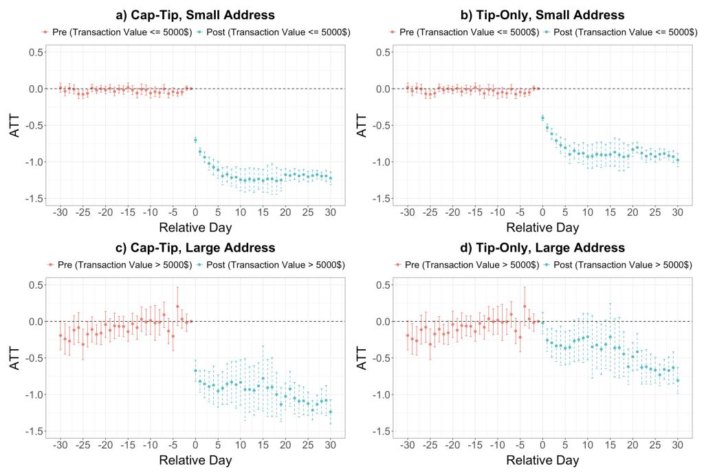 为解决上述问题,西安交通大学管理学院信息系统与智能商务系的赵玺教授与其博士二年级研究生吴志超、博士五年级研究生艾佩林,联合美国亚利桑那州立大学的尚广志(Guangzhi Shang)教授共同开展了相关研究。该研究团队利用观测期间内超过1.23亿笔交易,运用双稳健双重差分(Doubly Robust Difference-in-difference)估计器评估了Cap-Tip交易费用机制的引入对区块链用户福利改善的因果效应。
