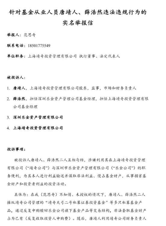 风险提示函附带的举报信中指出,对于存在严重违规行为的私募基金管理人(包括上海靖奇投资管理有限公司、深圳乐金资产管理有限公司及其他存在问题的管理人),请求依法撤销其基金管理人登记,取消业务资格,清理并终止其现有基金产品备案。文章最后的落款人是公司法定代表人范思奇。