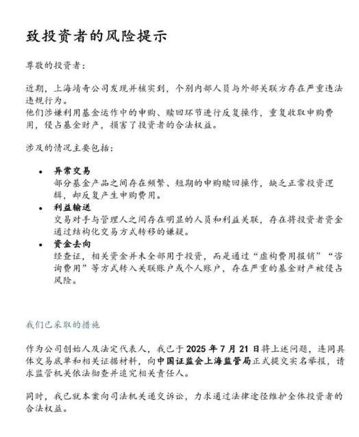 近日,量化私募靖奇投资通过其微信公众号发布《致投资者的风险提示》称,近期,上海靖奇公司发现并核实到,个别内部人员与外部关联方,涉嫌利用基金运作中的申购、赎回环节进行反复操作,重复收取申购费用,侵占基金财产,损害了投资者的合法权益。