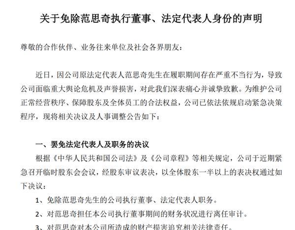 唐靖人向记者透露,目前公司已决议免除范思奇的法定代表人职务,工商变更不久后将会完成。而且公司与监管机构进行了沟通,接下来将继续维权,并交由司法部门解决相关问题。