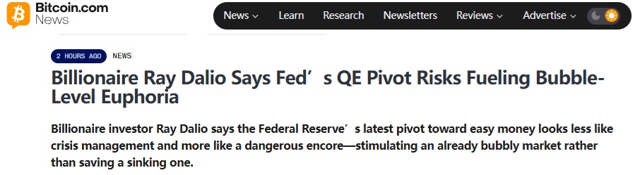 FX168财经报社(亚太)讯 亿万富翁投资人瑞·达利欧(Ray Dalio)表示,美联储最近转向宽松货币政策,与其说是危机管理,不如说是危险的返场之举——刺激已经泡沫化的市场,而不是拯救正在下沉的市场。
