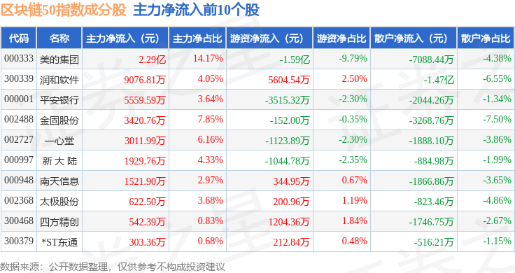 资金流向方面,区块链50(399286)指数成份股当日主力资金净流出合计14.86亿元,游资资金净流入合计1463.82万元,散户资金净流入合计14.71亿元。成份股资金流向详情见下表:
