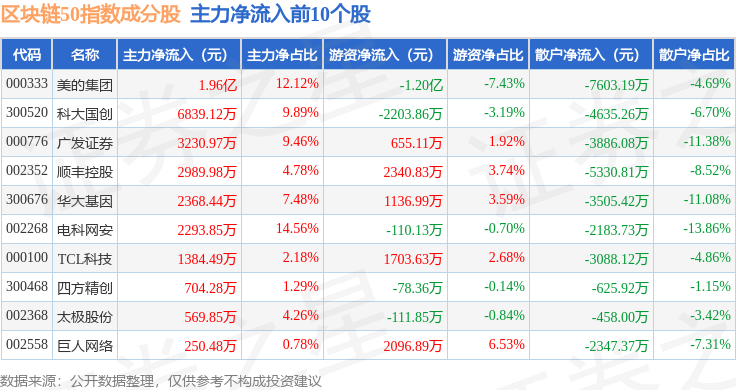 资金流向方面,区块链50(399286)指数成份股当日主力资金净流出合计11.41亿元,游资资金净流入合计2.76亿元,散户资金净流入合计8.65亿元。成份股资金流向详情见下表: