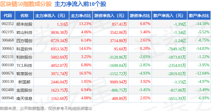 资金流向方面,区块链50(399286)指数成份股当日主力资金净流出合计11.23亿元,游资资金净流入合计4.44亿元,散户资金净流入合计6.79亿元。成份股资金流向详情见下表: