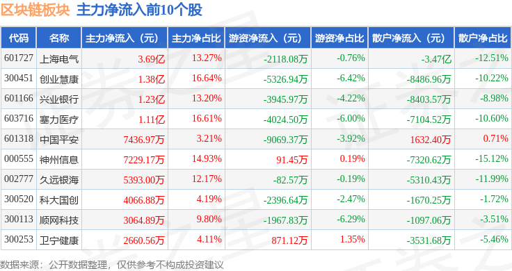 从资金流向上来看,当日区块链板块主力资金净流出39.3亿元,游资资金净流出3768.9万元,散户资金净流入39.68亿元。区块链板块个股资金流向见下表: