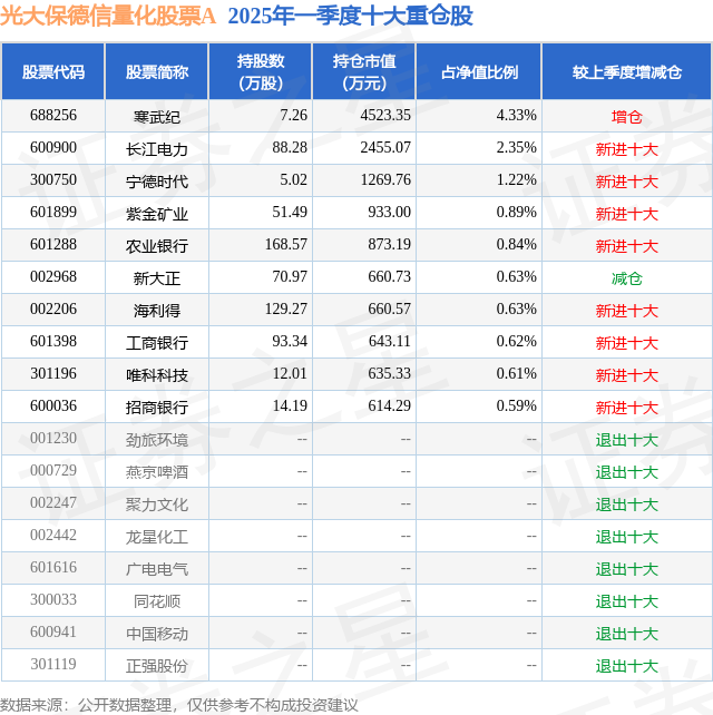 根据2025基金Q1季报公募基金重仓股数据,重仓该股的公募基金共1家,其中持有数量最多的公募基金为光大保德信基金的光大保德信量化股票A。光大保德信量化股票A目前规模为10.44亿元,最新净值0.9679(5月28日),较上一交易日下跌0.01%,近一年上涨17.58%。该公募基金现任基金经理为王卫林 朱剑涛。王卫林在任的基金产品包括:光大创业板量化优选A,管理时间为2023年8月22日至今,期间收益率为0.42%;光大保德信锦弘混合A,管理时间为2023年8月22日至今,期间收益率为13.98%;光大中证500指数增强A,管理时间为2023年8月22日至今,期间收益率为7.01%;朱剑涛在任的基金产品包括:光大保德信一带一路混合A,管理时间为2024年5月6日至今,期间收益率为5.36%;光大风格轮动混合A,管理时间为2024年10月26日至今,期间收益率为8.69%;光大诚鑫混合A,管理时间为2024年10月26日至今,期间收益率为19.95%。
