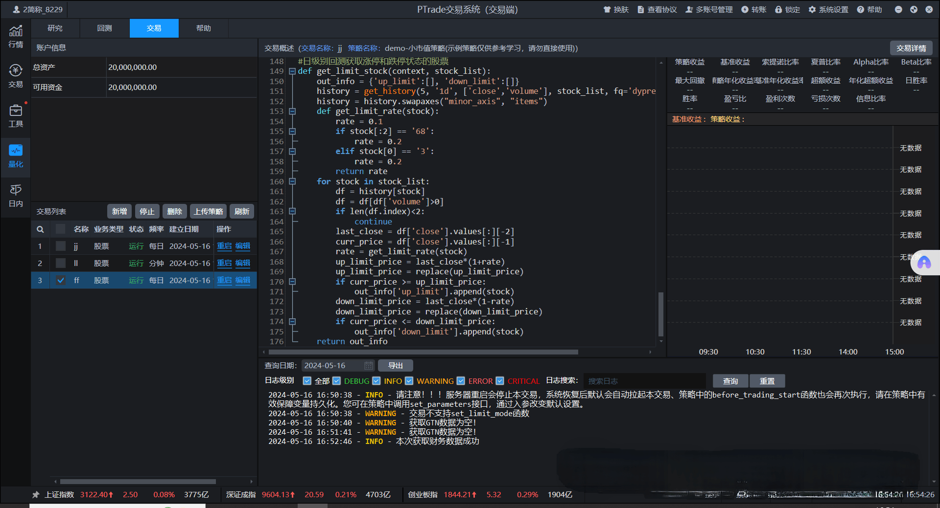 2、偏好云端策略执行的投资者:PTrade 的策略上传至云端服务器端运行,即使投资者关机或断网,策略也能继续执行,提高了交易的稳定性和便捷性,适合那些不希望受到本地设备和网络限制的投资者。
