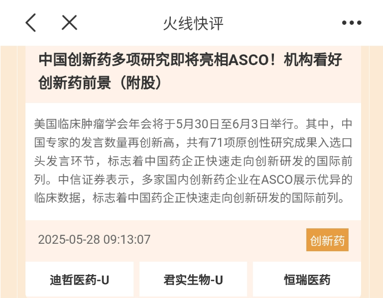 在每日经济新闻App私人订制的“火线日开盘前提到创新药板块,相关个股延续升势。