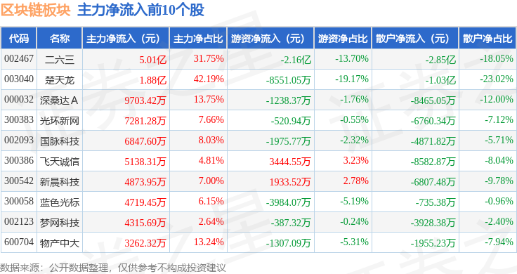 从资金流向上来看,当日区块链板块主力资金净流出43.23亿元,游资资金净流入259.39万元,散户资金净流入43.2亿元。区块链板块个股资金流向见下表: