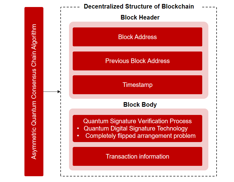 非对称量子共识链算法的设计:非对称量子共识链算法,将权益共识与量子技术融为一体。与传统的权益共识不同,其无需节点参与挖矿,从而消除了算力竞争。这使得整个系统更为去中心化,每个持有权益的参与者都有机会参与共识过程,而不仅仅是那些拥有更多算力的节点。