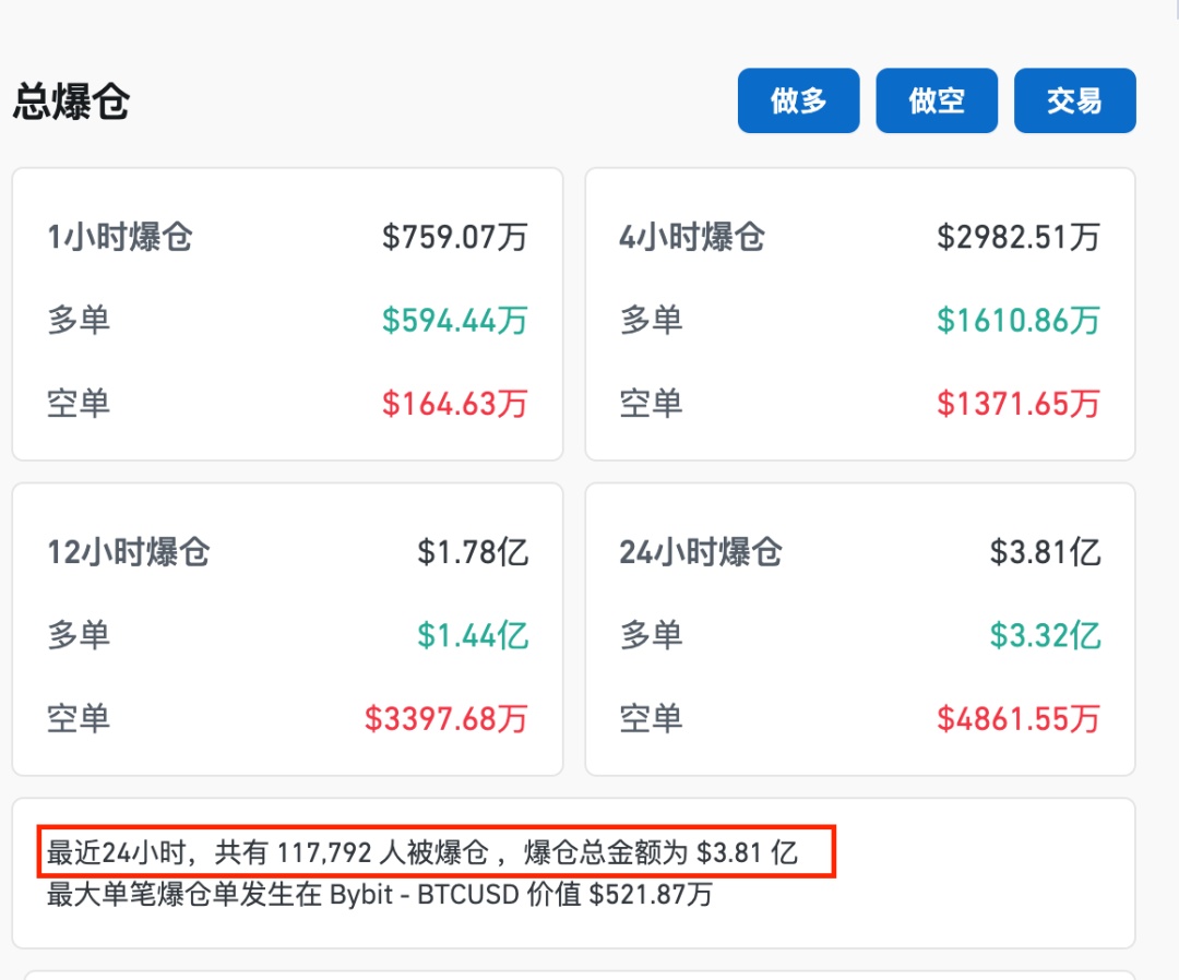 根据加密货币检测网站coinglass数据,最近24小时有约11.7万人爆仓,爆仓总金额为3.81亿美元。