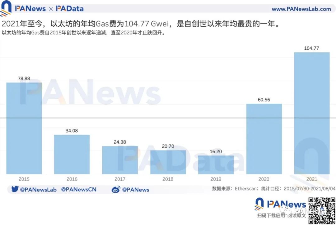 5、2021年至今平均Gas价格为104.77 Gwei,是自创世以来均价最贵的一年,6年增长了约33%。