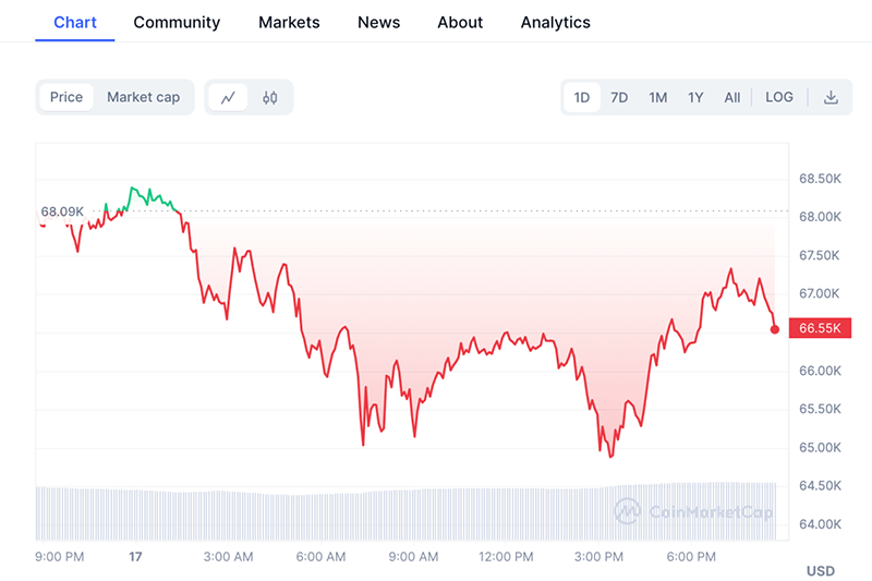 北京时间3月17日上午,比特币价格一度跌破65000美元整数位,跌幅超过6%;以太坊价格一度跌穿3500美元/枚,跌幅达到9.77%。