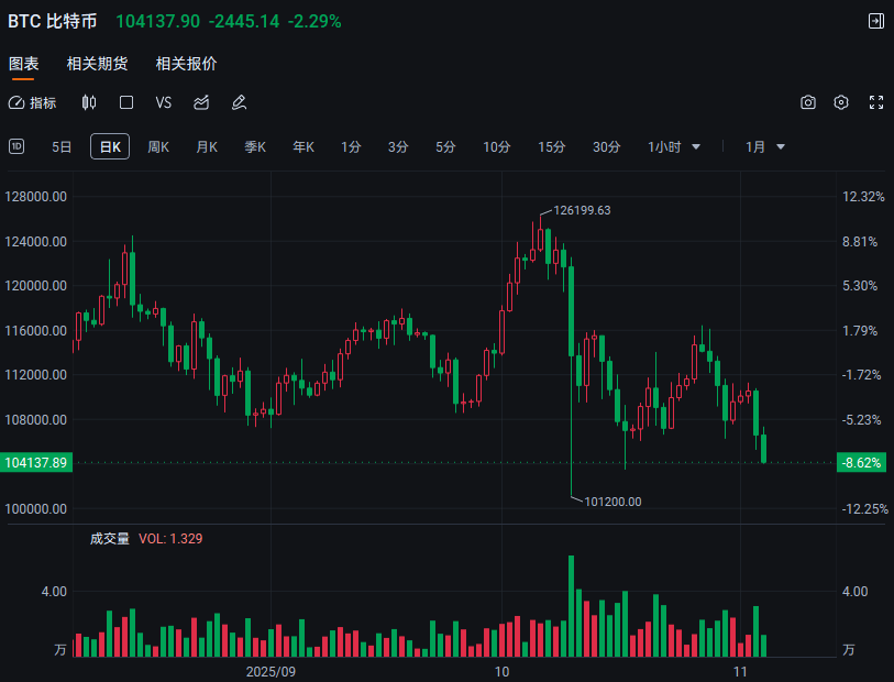 比特币延续跌势,一度跌至逾两周低位,逼近10.4万美元关口。全球第二大代币以太币跌3.4%至3500 美元下方,从近期高点进一步回落。