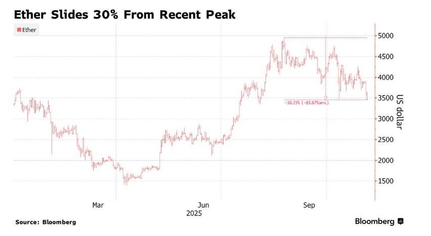 关于以太坊的企业买盘试验似乎正在实时瓦解。全球市值排名第二的加密货币——以太坊在周二跌破3400美元,随着华尔街对AI热潮所推动的股票市场看涨狂热情绪显著消退,市场风险偏好急剧下行,以太坊以及“加密货币风向标”比特币等加密货币均跟随美国科技股回调势头同步下滑,但是加密货币的回调幅度相比于美股而言剧烈得多。