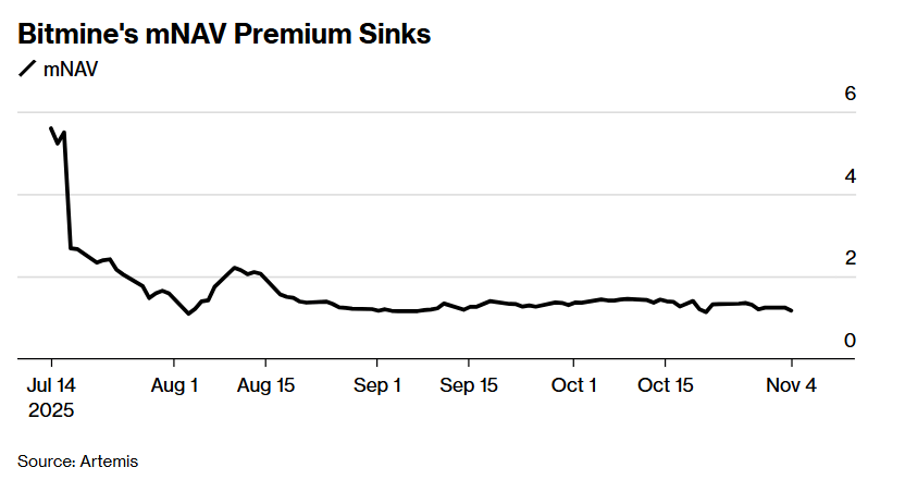 根据Artemis 的统计数据,Bitmine市值与净资产价值的倍数(mNAV)已从7月的 5.6倍暴跌至当前的1.2倍,而Bitmine的股价自今年创下的历史峰值以来已大幅下跌 70%。