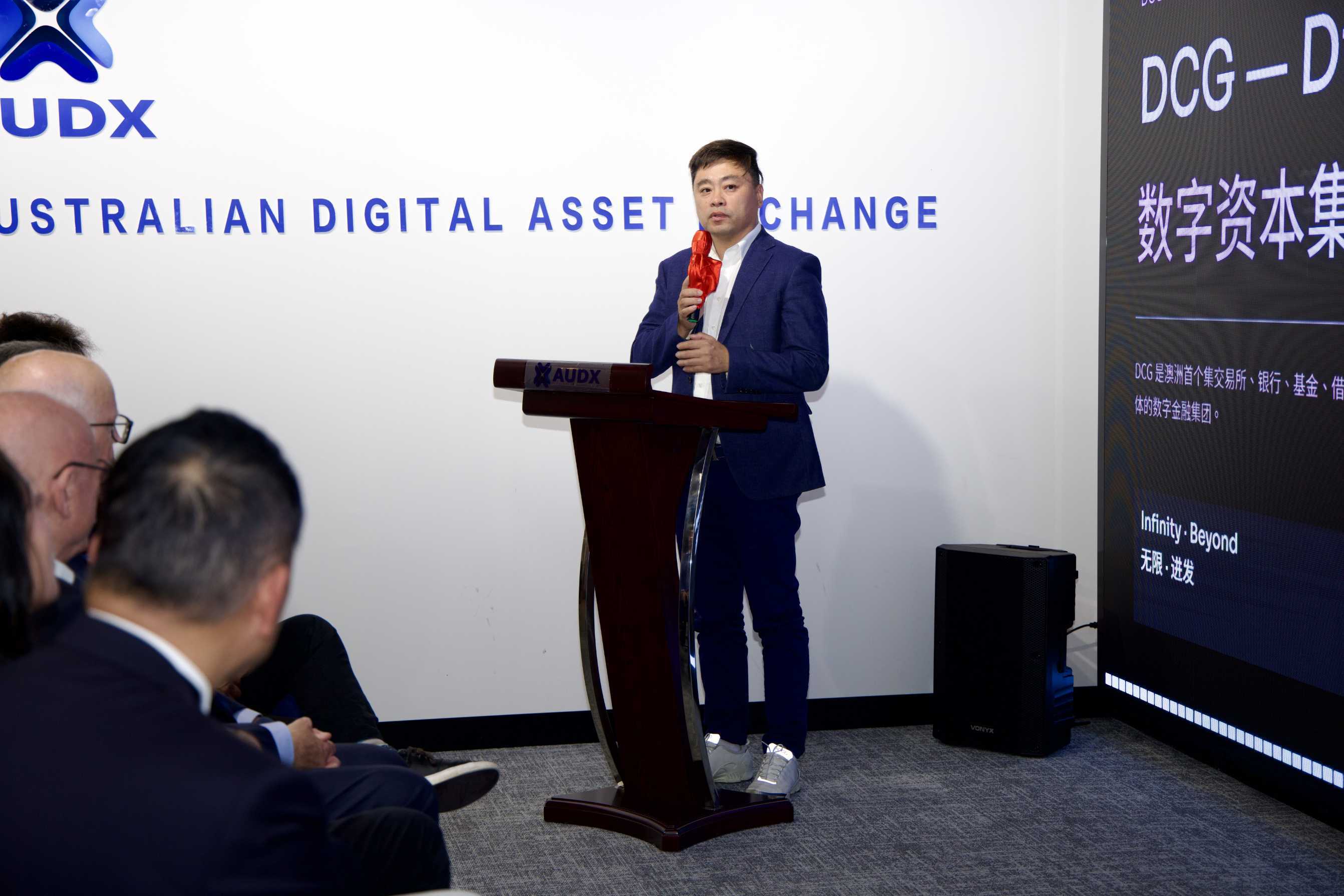 正式环节由DCG主办方代表Gavin Xu博士的开场致辞开启。他系统性地阐述了DCG的发展历程,2016年成立DCG集团,总部设立于澳大利亚悉尼,开启立足澳洲、辐射全球的数字金融布局;2022年全球数字资产交易所DAEX正式上线,开启RWA资产数字化;2023年,GDB 数字钱包投入使用,构建数字银行生态,结合中心化与去中心化钱包功能,实现区块链支付等Web3.0生态应用落地;2024年启动NEW VISTA FUND数字资产投资,成立澳洲第一只主动型数字货币投资基金;2025年,全球数字资产交易所DAEX品牌升级为 AUDX Australia,专注全球 RWA 数字资产交易,同时推出 AUDX Global,扩展至数字货币、大宗、指数及股票等综合资产RWA交易。