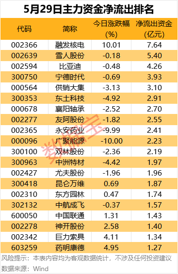 27股主力资金净流出超1亿元,其中11股净流出超2亿元。其中,融发核电主力资金净流出7.64亿元,该股目前已经连收5个涨停板,近日核电、可控核聚变概念反复活跃;雪人股份、比亚迪、宁德时代、供销大集主力资金净流出金额均超3亿元。