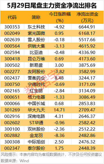 净流出方面,东土科技、紫光国微、雪人股份、供销大集、比亚迪、昆仑万维尾盘主力资金净流出金额居前。