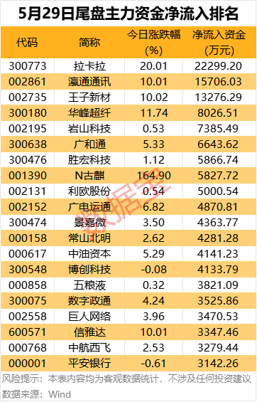 个股方面,拉卡拉、瀛通通讯、王子新材尾盘获主力资金净流入超1亿元;华峰超纤、岩山科技、广和通、胜宏科技等净流入均超5000万元。