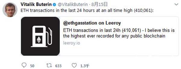 行业方面,据悉,以太坊联合创始人Vitalik Buterin本周二在推特上转发了一项以太坊交易额记录:“以太坊在过去24小时内的交易量创下历史新高410,061”