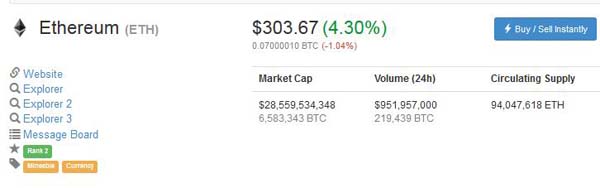截止发稿前,以太坊的价格稳定在300美元以上,过去24小时的增幅达4%,市值约为285亿美元左右。